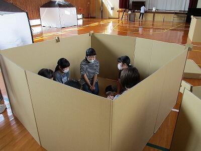 今回のレクリェーションは、防災への関心を高めることを目的に行われました。防災士の方を講師としてお呼びし、体育館内を避難場所として想定しながら段ボールのパーテーションや簡易テント組み立てたり、災害時の調理法について学んだりしました。また、その合間には、運動会の赤白に分かれてジェスチャーゲームをしたり、”だるまさんがころんだ”をしたりしながら体を動かしていました。