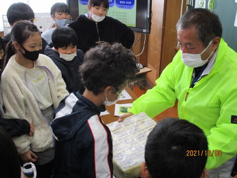自分たちが育てたお米を売ったお金で、もち米を購入し、昔ながらのもちつきを体験しました。自分たちで準備をしましたが、できないところは5年生の保護者やPTA役員が協力してくださり、おいしいお餅を搗くことができました。杵でついたり、できた餅を丸めたりと忙しかったですが、全校分のお餅をつくって配ることもできました。