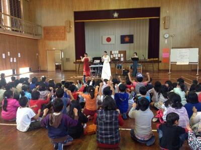 ARUKUの3名が来校し、体育館でスクールコンサートが行われました。フルート・オカリナの美しい音色、流れるようなピアノ伴奏、心に響き渡るソプラノの歌声に、子どもたちはうっとりとしていました。また、世界各国の有名な曲だけではなく、本校の校歌やアニメソング、流行歌などの演奏もあり、子どもたちはとても満足していたようでした。