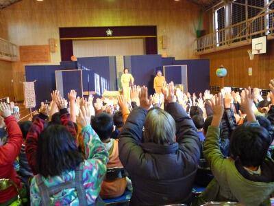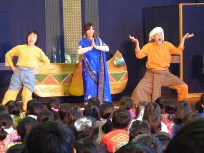 劇団風の子九州においでいただき、「どんぶらこっこ どんどこ亭」という演目で、アジアの伝承民話や物語、昔の遊びの紹介をしていただきました。途中、代表児童が参加する場面や職員が登場する場面などもあり、大変盛り上がりました。