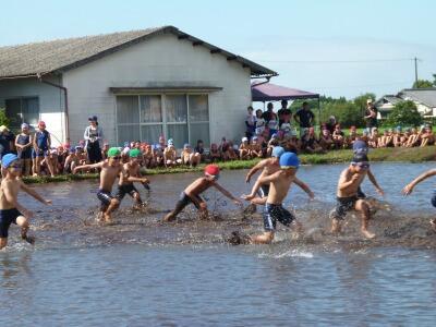 台風の接近が心配されたため、予定を1日前倒しして「どろリンピック」を行いました。「どろリンピック」は10年以上前から本校で行われている学校行事です。泥の感触を楽しみながら、田んぼの中で様々な競技を行います。今年は、20m競走、20m障害走、どんぐり班対抗つなひきゲームを行いました。子どもたちは泥まみれになりながらも、生き生きと活動していました。体についた泥を落とすのは大変そうでしたが…。