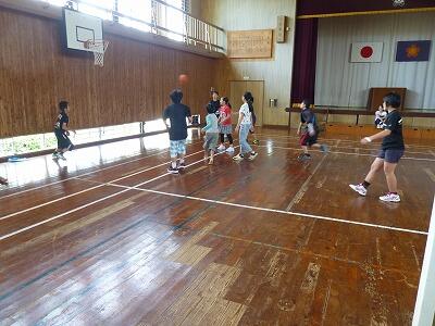 学校の体育館で、「色ミニバレー」、「カローリング」、「アジャタ」、「バスケットボール」などを親子で楽しみました。役員の方々が、いろいろな用具や器具を準備してくださっていたので、楽しく活動することができました。