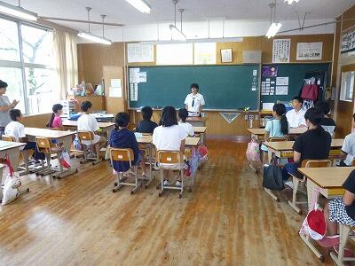 9月15日木曜日の朝の時間に、東小学校出身の唐瀬原中学校1年生の2名の生徒が来校して、6年生に中学校生活の発表をしてくれました。