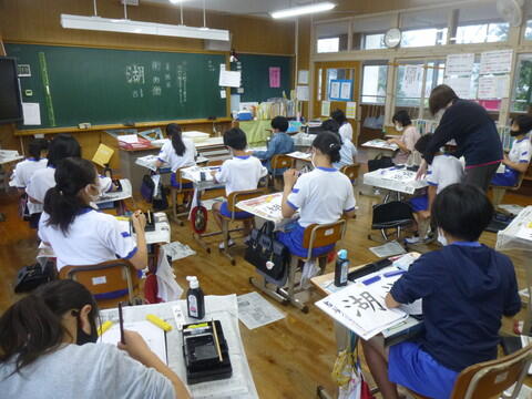 運動会の練習で忙しい6年生ですが、書写の時間は、心を落ち着かせ真剣に毛筆の練習をしていました。今日書く時は、3つの部分から成り立つ漢字「湖」でした。どのように字形を整えて書けば、きれいに書けるかを考えながら練習をしていました。