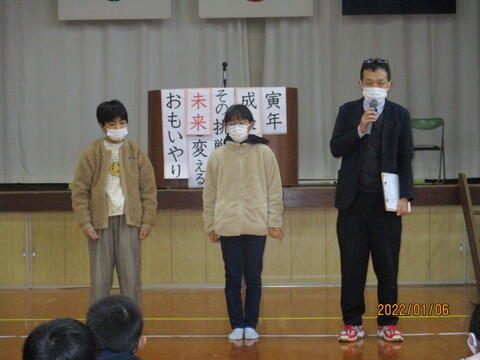 始業式の最後に、1月10日の市町村対抗駅伝の選手として出場する2人の6年女子児童にみんなで激励の拍手を送りました。川南町の代表として頑張ってくれることと思います。