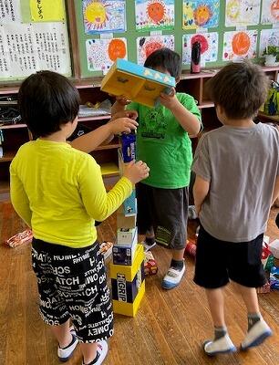 友だちとたくさんの箱を積み上げたり、並べたり、形をつくったりして楽しみながら形の特徴に気付いていくことができました。