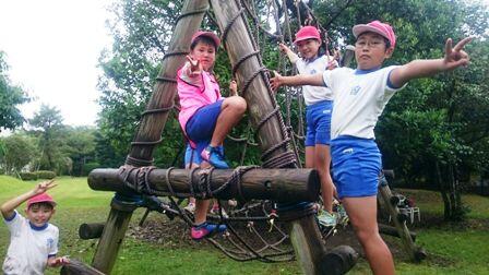 みんな元気に朝ごはんをしっかり食べ、今はフィールドアスレチックに挑戦中です。