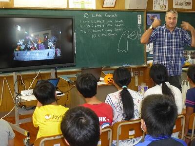 5・6年生は、ALTのジェフ先生にハロウィーンの写真などを見せてもらいながら外国の文化について学ぶ「国際理解講座」を行いました。