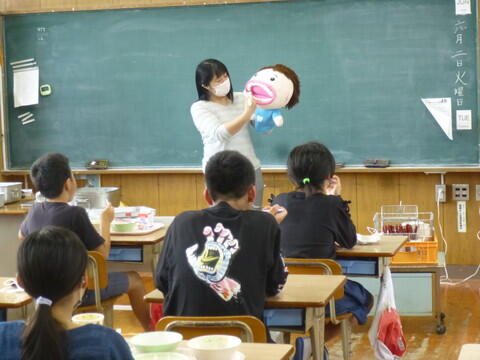 6年生の教室で子どもたちの歯ブラシのチェックをした後、歯磨きの正しいブラッシングの仕方を養護教諭から教えてもらいながら、歯磨きをしました。