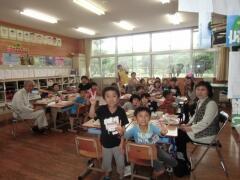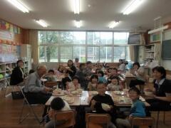 また、本日はGBA(じいちゃん・ばあちゃん・あつまろ会」も開かれ、お孫さんがいらっしゃる学年の教室でいっしょに給食を食べました。みんないい顔していますね。