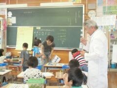 下2枚の写真は、2年生の生活科の様子です。自分たちで捕ってきた虫(チョウやバッタ)の特徴を観察するのが目的です。子どもたちは、生き物名人(サイエンスアドバイザーの冨岡先生)に分からないことや興味深いことを質問していました。目を輝かせて学習しているのが印象的でした。