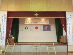 研究公開20日(金)まで後1週間となりました。左写真のステージには横断幕を、左右には垂れ幕を設置しました。はしごで高いところに上がっての作業は結構こわかったです。横断幕は、町の技術員さん方がきれいに設置してくださいました。右写真は側面の掲示で、これまでの理科の授業や研修の様子を紹介しています。