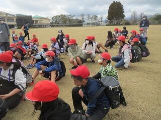 全体で行う「陣取り」の説明をしている5年生です。