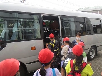 みんなでバスに乗って出発です校長先生も見送ってくださいました。