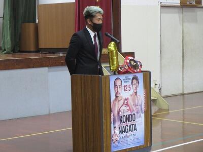 スーパー・ライト級、東洋太平洋チャンピオンの永田大士様が本校に御挨拶に来てくださいました。私たちには分からないぐらいのたくさんの努力を重ねてつかみ取ったチャンピオンベルトも見せてくださいました。永田様の前へ前へと突き進んでいくお話を聞いて、子どもたちのやる気も増していくことだと思いました。
