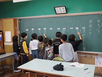 【この1年間、国語でどんなことを頑張っていくのか、全員黒板に書いて共有中】