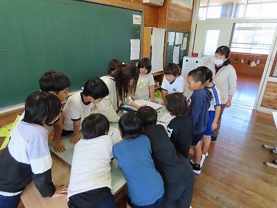 【先生の周りに集まり、前のめりで学習中苦笑い
