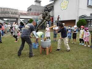 児童が杵でつけるようになる前の餅つきです。さすが様になっています。
