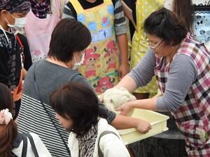 つきあがった餅を移動します 「はーい、しっかり丸めて!」