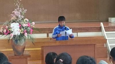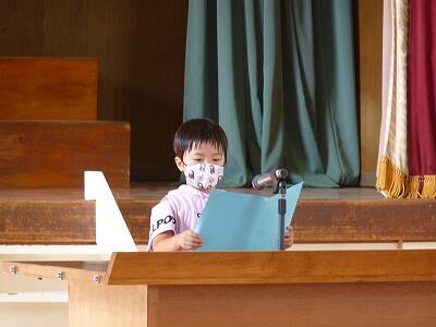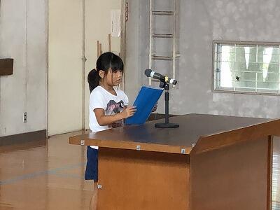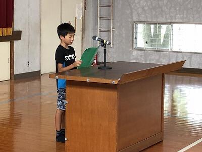 児童の代表挨拶では、3年生の2名の児童が、1学期できるようになったことや、2学期頑張りたいことを堂々と述べることができました。