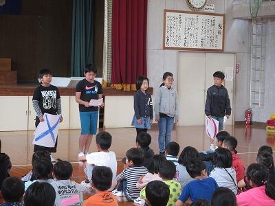 つぎに、4年生の翔多さんと奏さんが、1学期の反省をもとに2学期のめあてについて、りっぱに発表しました。