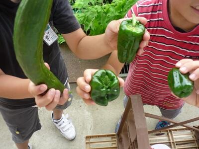 収穫されたばかりのキュウリやピーマンを見せてくれました。「この形の悪いピーマン