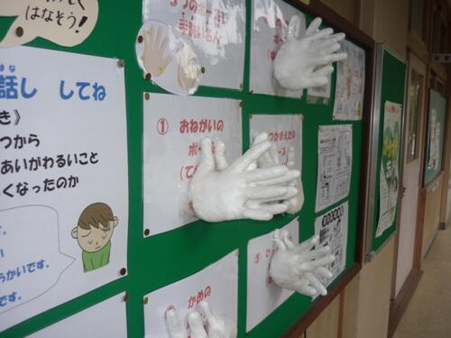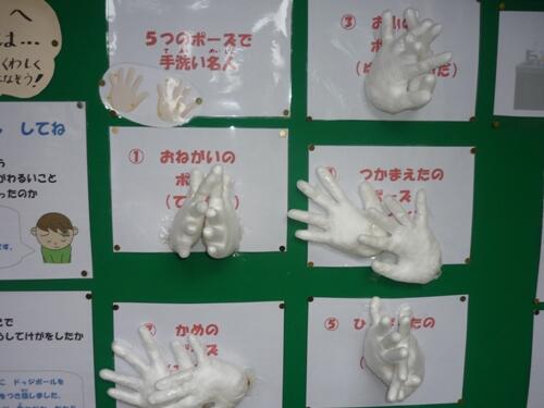 手洗いのポーズを立体的にしたものです。子ども達は必ず立ち止まって見ていきます。
