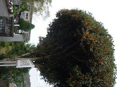 橙色の花をつけるのは金木犀、白っぽい花をつけるのは銀木犀だそうです。学校のは