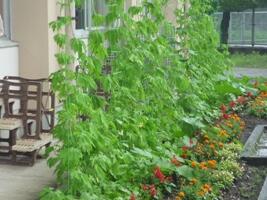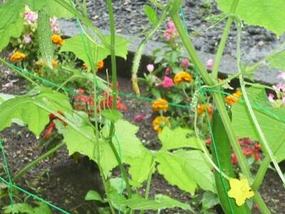 省エネを目的に、今年も職員室と校長室前の花壇にグリーンカーテンになるゴーヤを5月中旬に植えましたが、約一ヶ月が経過し、梅雨時で雨の多い日が続きますが、ゴーヤも随分成長しました。