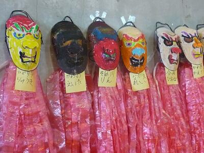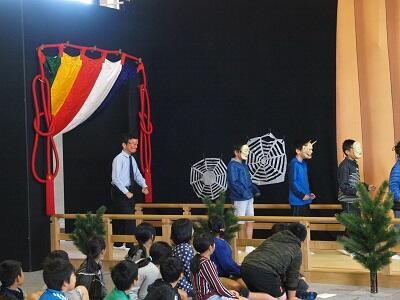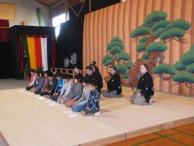 本物の「面」をかぶってのすり足での入場です。「あまり見えなくてなかなか歩くのが難しかった」とのこと。職員も挑戦しました。すり足がなかなかうまかったです。
