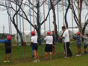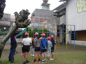 本校では、学校施設の安全点検を毎月、職員全員で行っていますが、学期1回、全児童による縦割り班での遊具の点検を行っています。日ごろ遊んでいる遊具を職員の目線でなく児童の目線で点検することは、改修したほうがいい部分等が見つかる場合もあります。また、遊具の正しい遊び方も考えることができるのです。小規模校だからできる点検です。今回は異常なし!