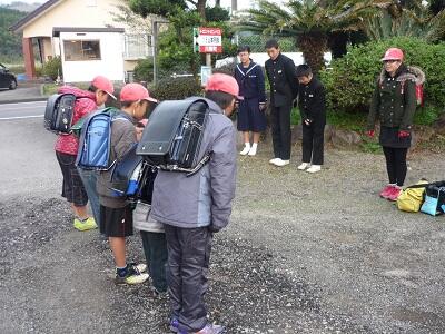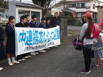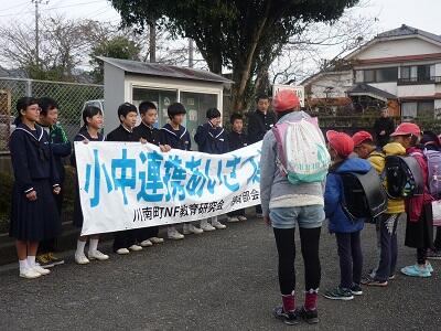 町のNF教育研究会徳育部会では、中学校区で連携してあいさつ運動をしています。本日は朝から、唐瀬原中の1・2年生(本校の卒業生)があいさつ運動に来てくれました。中年生もこの前小学校を卒業したように感じますが、かなり大人びた感じがするものです。懐かしい面々でした。「中学生 ありがとう!」