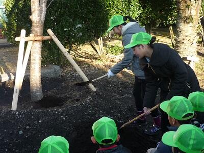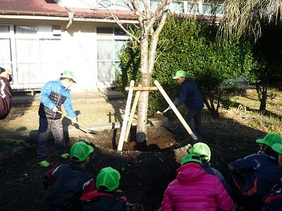 1月14日(土)にみどりの少年団で植樹活動を行いました。昨年は校庭にいろは楓や桜を植樹しましたが、今年は「よしの桜」を山本自治公民館との境に植樹しました。かなり大きな苗木なので、今年の4月には桜の花が見られそうです。