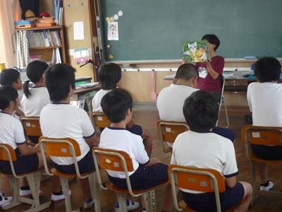 本日、9月の読み聞かせがありました。本校は、読み聞かせボランティアグループの花咲会の方々に読み聞かせを行っていただいております。子ども達は、目を輝かせて、読み聞かせを聞いています。隣の石井記念川南保育園の先生方も毎回、読み聞かせに来ていただいております。保小連携の一つの取組です。