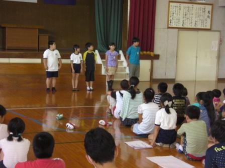 業間に5年生の発表集会がありました。まず、朝の会の様子を再現した発表でした、体力向上の運動や詩の朗読等でした。
