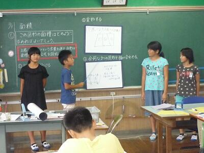 本日(9日)、運動会でしたが、雨天のため10日に順延になりました。明日は好天にめぐまれそうです。そのため、本日は授業日になりました。水曜日に実施予定でした、3年と5年の算数科の研究授業を行いました。3年生の授業では、具体物を使った操作活動や三角形の仲間わけの仕方を考えていったり、5年の授業では、今までの学習内容を使って台形の面積の公式を求める方法を自分・ペア・全体で練り上げていったりする授業でした。それぞれ課題に応じた授業が展開されました。