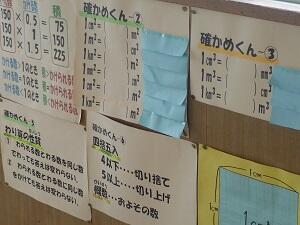 本校では、児童の学力をすこしでも底上げしていこうと、共同で算数科の研究をしてます。特に児童が主体的に学習に取り組んだり、学びを深めたりするためにどのような手立てをとればよいのかを授業実践を通して究明しています。各学年とも授業後に学習した内容が一目でわかるように掲示したり、児童の興味を持って取り組めるような問題コーナーを設置したりしています。