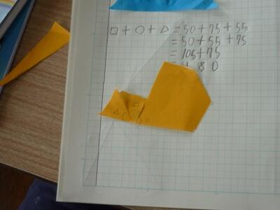 5年生は、今、「合同な図形」を学習しています。本時は「三角形の内角の和が180°になることを理解する」学習でした。まず三角形をつくり、3つの頂点を切り取り、3つの内角をあわせていくことで、確かに180°になります。具体的な操作活動を上学年でも大切です。