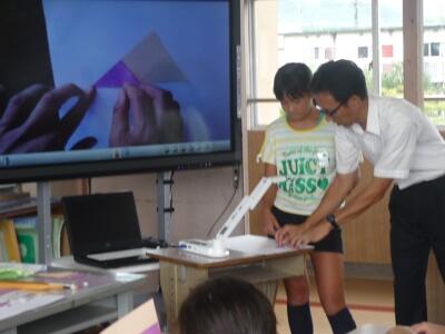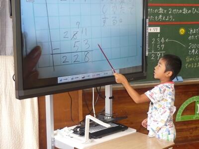 川南町では、効果的な学習指導の一つとして、ICTの活用を進めています。デジタル教科書や電子黒板、OHCなどが導入されています。本校でも、本年度、電子黒板を全学級に入れていただきました。デジタル教科書と教育機器等を活用して、効率的な指導と児童の興味や関心を高め、指導内容をより定着させていこうと、職員もICTの効果的な活用に取り組んでいます。