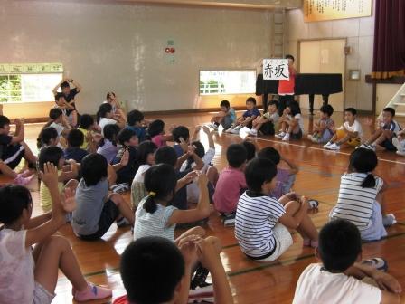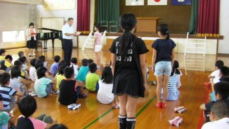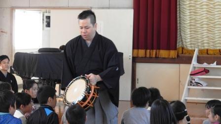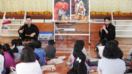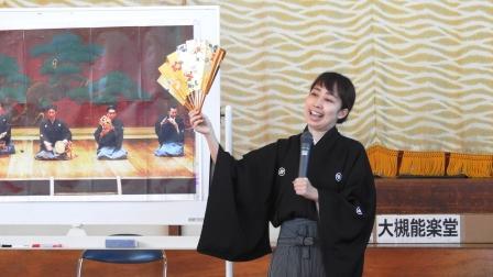 はじめに、能楽の紹介があり、能楽の衣装や楽器(笛や小鼓等)の説明があったり、お囃子や校歌を謡う体験を行いました。