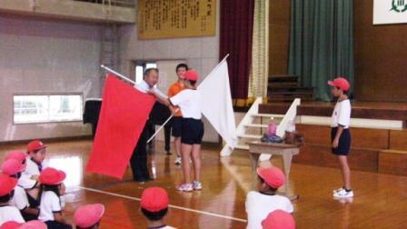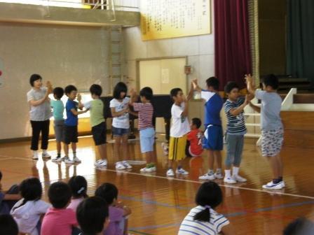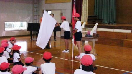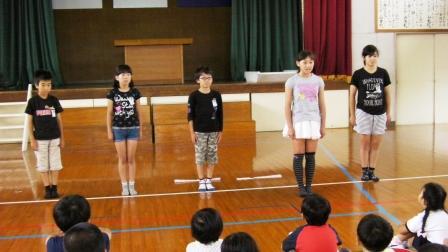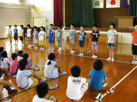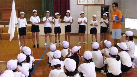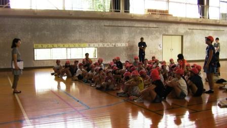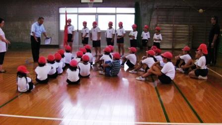 体育館前で1班から6班までの縦割り班に並び、自己紹介をして、1年生は川南小学校