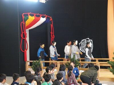 本物の「面」をかぶってのすり足での入場です。「あまり見えなくてなかなか歩くのが難しかった」とのこと。職員も挑戦しました。すり足がなかなかうまかったです。
