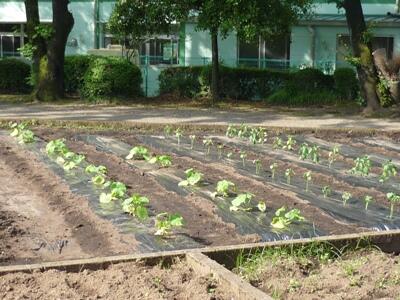 昨年度まで、サツマイモを栽培していました学習園に今年は、輪作の弊害を避け、サツマイモ以外の野菜の苗を6年生が植えてくれました。カボチャやオクラ、ピーマンなどです。沢山の実をつけてほしいです。