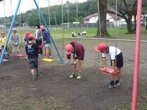 本校では、学校施設の安全点検を毎月、職員全員で行っていますが、学期1回、全児童による縦割り班での遊具の点検を行っています。日ごろ遊んでいる遊具を職員の目線でなく児童の目線で点検することは、改修したほうがいい部分等が見つかる場合もあります。また、遊具の正しい遊び方も考えることができるのです。小規模校だからできる点検です。今回は異常なし!