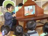 今日、委員会活動の時間に、ブックスマイル委員会の児童が、川南保育園で、年中、年長の園児さんに紙芝居や絵本の読み聞かせをしました。最初は緊張した面持ちでしたが、徐々に慣れて、上手に絵本を読んでいました。園児さんも興味深く聞いてくれました。とても聞き上手でした。