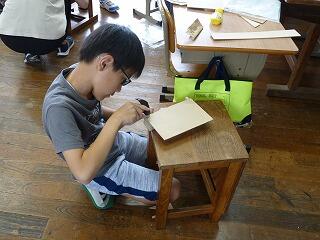 のこぎりや金づちなどの使い方を学んだ後、実際に板を切り、釘で打ち付け、作品を作っています。のこぎりと板の角度をいろいろと試してみたり、金づちを持つ場所を変えて打ちやすいところを探したりと、工夫しながら取り組んでいます。