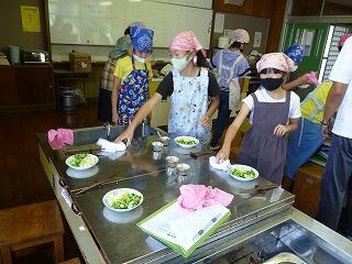 1年生は、野菜を洗ったり、切ったりと、いろいろな作業にチャレンジしていました。5年生は、家庭科で調理実習を経験していることもあり、進んで調理に取り組んでいました。