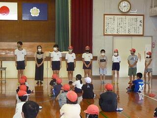 2学期の目標発表では、4年生の黒木 翔さんが、「忘れ物をしないようにすること、漢字をしっかり覚えること、ボランティアを頑張ること」について発表しました。4年生の渡邊 壱心さんは、「社会のテストを頑張ること、忘れ物をしないこと、運動会でソーラン節をかっこよく踊ること」について発表しました。