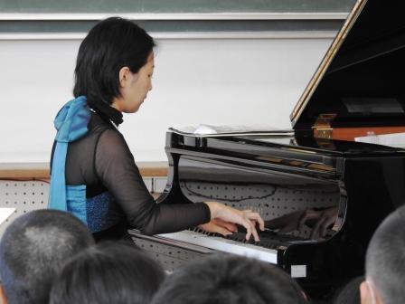本日3校時、鑑賞教室を行いました。本年度の鑑賞教室は、メディキット県民文化センター(宮崎県立芸術劇場)のアウトリーチ事業(訪問コンサート)により、ピアノ演奏家の高場涼子さんによるコンサートを開催していただきました。総勢5名の方々においでいただきました。