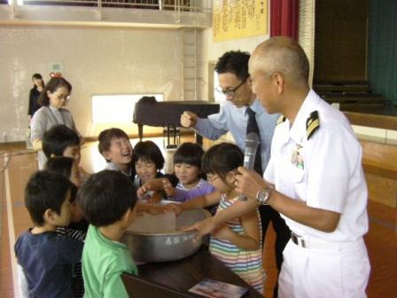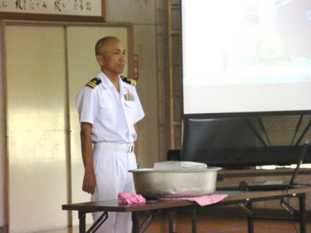 山本小学校の卒業生で自衛隊のヘリコプター飛行長の田原ますのりさんが来校されました。南極観測隊員として南極に行かれた時の、南極のこおりを届けていただきました。
